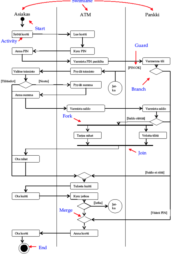 Käyttötapauksia voidaan hahmottaa myös aktiviteettikaavioilla, josta esimerkki alla: