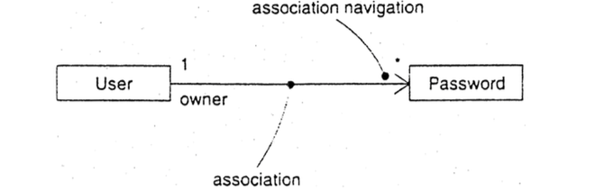 Oletusarvoisesti assosiaatio mahdollistaa suoran viestinnän molempiin suuntiin. Jos suunnittelun aikana haluamme märittä tarkemmin, onko viestintäyh- teys molempiin suuntiin vai vain toiseen suuntaan, voimme tehdä sen avoimella nuolenpällä (association navigation). Esimerkiksi jos salasanaa etsitän pelkästän Käyttäjä-olion kautta, voidaan navigointisuunta märittä kuvan (Booch ym, 1999, 144) kaltaisesti. Yksisuuntaisilla assosiaatioilla voidaan vähentä luokkien väli- siä riippuvuuksia ja näin yksinkertaistaa esim. muistinhallintaa kielillä, joissa ei ole automaattista muistinsiivousta.