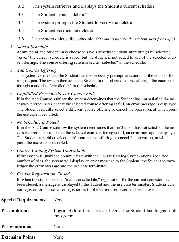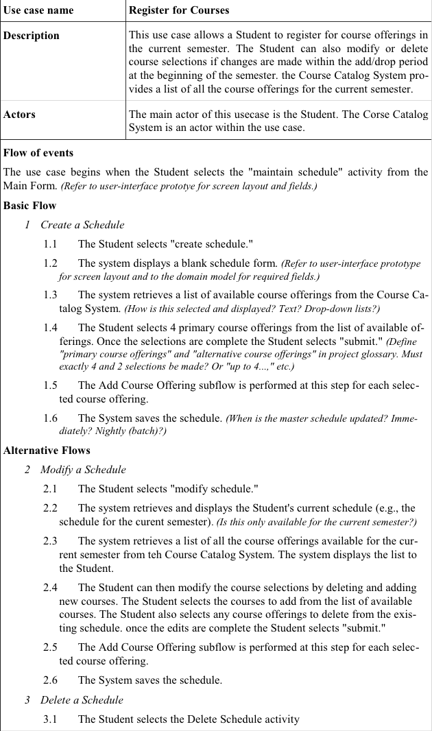 Käyttötapauksen sanallista kuvausta kutsutaan skenaarioksi (Schach 2002). Käyttötapausskenaariolla on aina lähtötilanne ja lopputilanne. Käyttötapaus kuvataan järjestelmän ja käyttäjän välisenä vuorovaikutuksena. Kuvaukseen voidaan merkitä huomautuksia ja poikkeuksia. Poikkeuksella tarkoitetaan tilannetta, jossa käyttötapauksen suorittaminen ei onnistu.