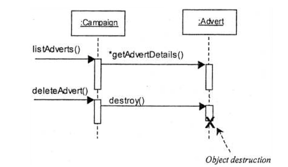 - Olion tuhoaminen osoitetaan palkin loppupän yli vedetyllä ristillä ja palauteviestillä; olion tuhoaminen voi olla myös täoisen olion lähettämän viestin (destroy) seurauksena (destruktori, hajotin – Javan tapauksessa kuvaa tilannetta, kun olioon ei ole enä viitteitä, jolloin se voidaan poistaa muistinsiivouksen yhteydessä )